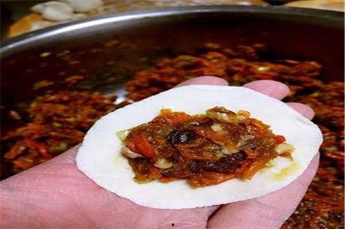 2. 放馅料:将擀好的饺子皮放在手掌心,用筷子夹适量馅料放在饺子皮中间。
